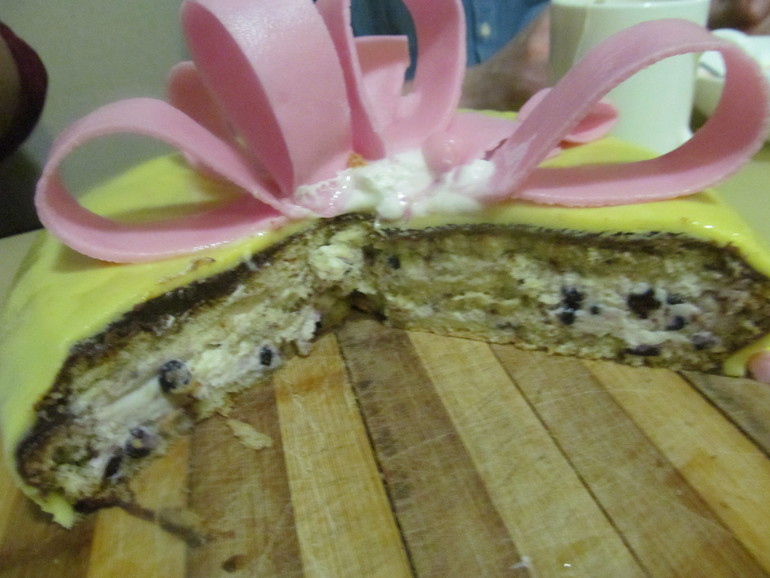 Проба пераДелала впервые на ДР невестке, 31го декабря, внутри ванильный бисквит с шоколадной крошкой, крем из сливочного сыра и черники.
