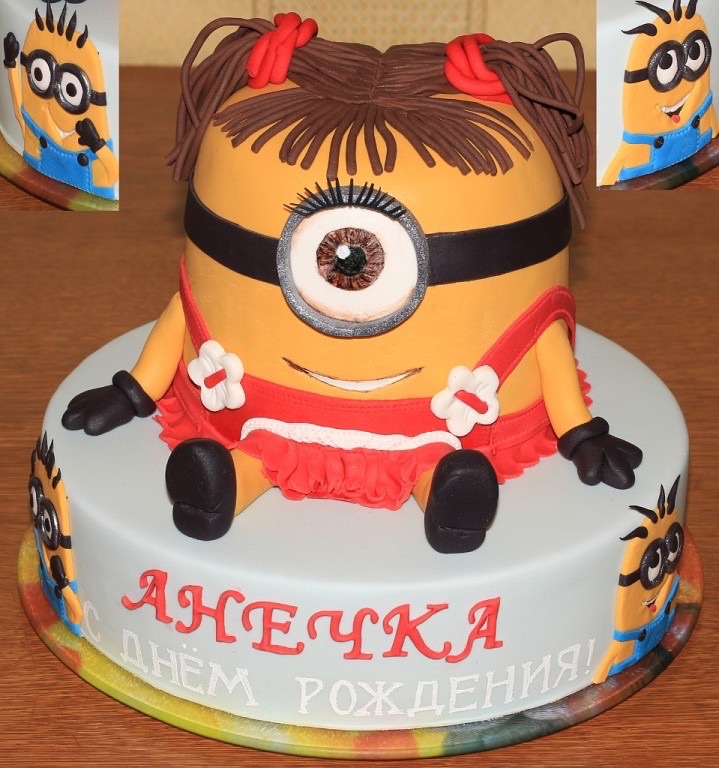 Спасибо. Все очень маленькое и составы легкие. Нижний ярус — ванильный на кипятке с маком, крем сливки и маскарпоне (2:1). Диаметр 24 см и высота всего 5,5 см. Получился в обтяжке чуть больше 2 кг. А сама Миньоночка — это медовик и сметанный крем, у нее диаметр 13 см и высота 12 см всего. Пухляша получилась, но более правильные пропорции не позволили сделать ограничения по весу. Мастику я тоже тонко раскатываю.
