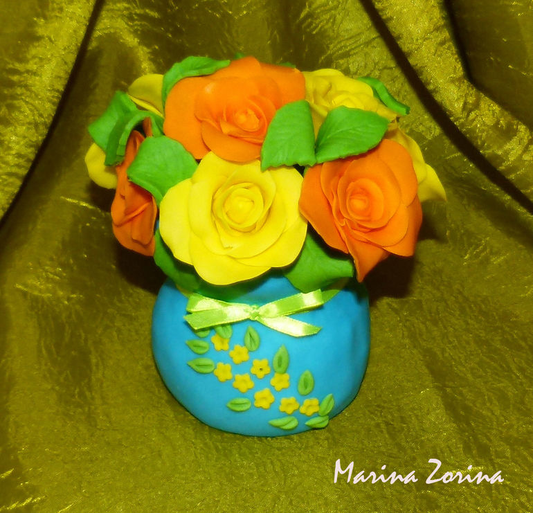 Фигурки и цветы из мастикиПопулярные у меня съедобные поздравления букет в вазе. Внутри "картошка" с грецкими орешками и коньяком :)
