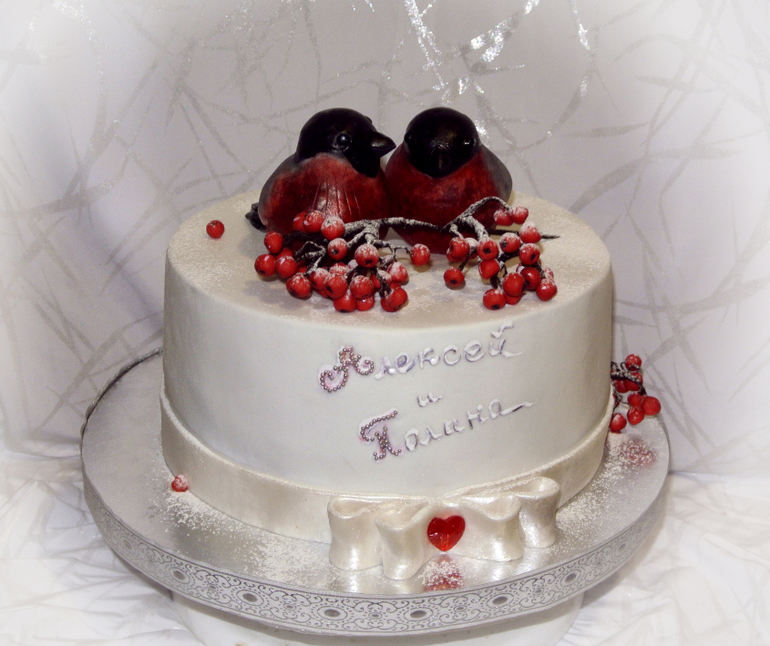 Торты свадебныеИзначально было решено делать торт в два цвета, определились с красным, так как у невесты в букете был гиперикум. Вот и родилась мысль спроецировать (если можно так выразиться) зверобой в ее букете на веточку рябины с парой снегирей.