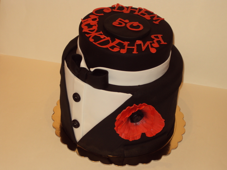 Просто смокинг, на пятидесятилетие мужчины. Идя из интернета, к сожалению не знаю чья(. Низ-3 шоколада, верх киевский.
