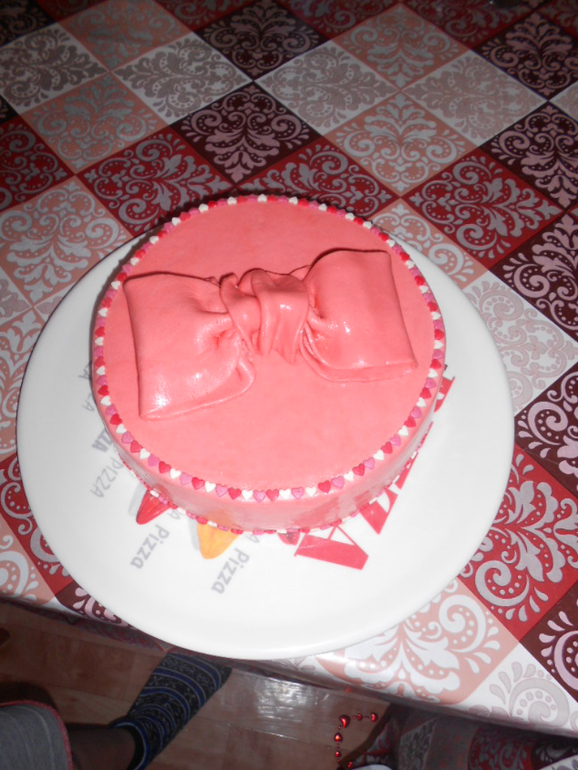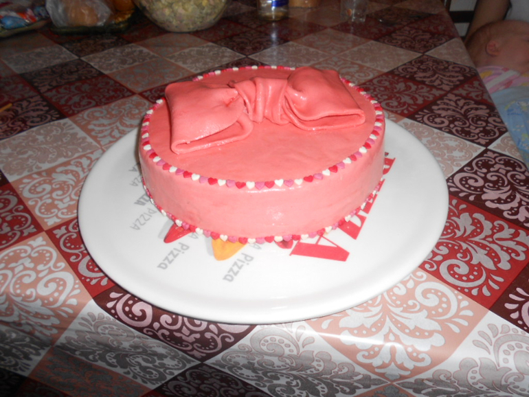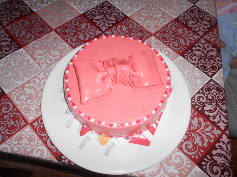 Нууу, если без преса и кольца, то он весьма ровный получился,) бантику не хватает объёмности и хвостиков, на мой взгляд) а в целом, для первого тортика он получился осень симпатичным))