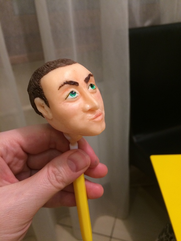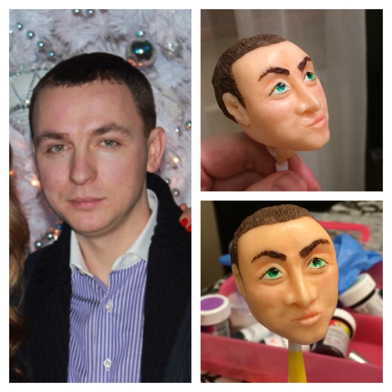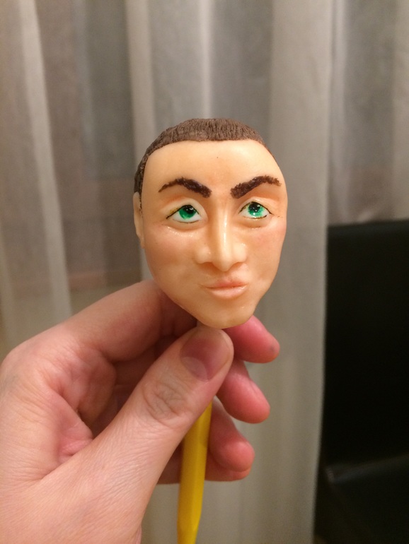 знаешь, вот если бы я мастику в руках не держала, то мне бы однозначно понравился (я бы на твоем месте его заказчикам все же предложила). от себя скажу: 1. не соблюла пропорции головы — лоб занизила, губы подняла к носу; 2. слишком большие глаза. поэтому и лицо кажется мультяшным — прорисовка очень яркая и не реалистичная. в др раз не бойся поменьше глаза "открывать"; 3. нижнюю губу выдвинула сильно, поэтому и ощущение, что целоваться лезет; 4. широкие и крупные крылья носа. смотри — у него крылья прижаты к кончику носа, который сам по себе большой, а не острый орлиный; 5. не прижимай уши — они сзади все же от головы отодвинуты. удачи! уверена, в др раз будет лучше! планируй сразу на голове черточками, где будет какая деталь, а потом не сдвигай эти пропорции