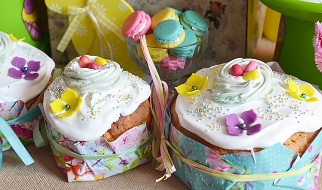 1. Классический Православный кулич. Сдобное тесто (на деревенских желтках), с добавлением изюма (по желанию цукаты), покрыт белковой глазурью. Украшаю цветной кондитерской посыпкой и авторским декором из мастики (не фигурки, мелкие детали).