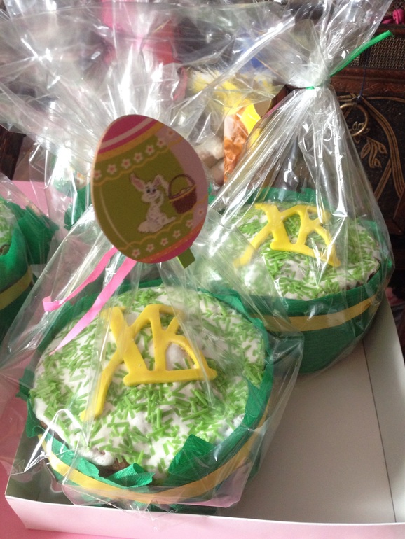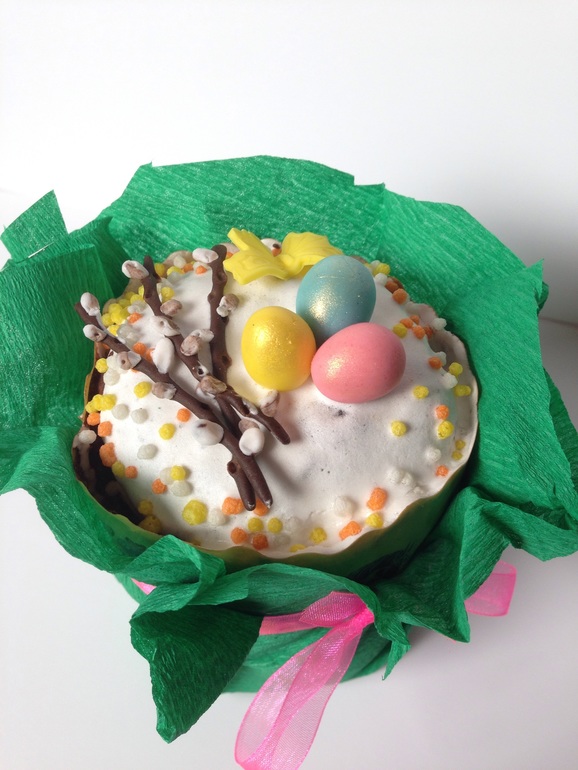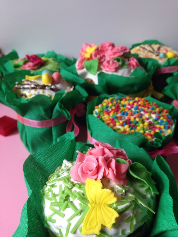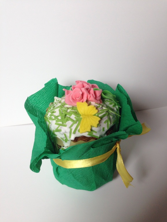 Куличики очень красивые, хоть на выставку. Меня зеленая бумага смущает. Просто по-моему когда на эту бумагу попадает вода, она красится. А если Ваша знакомая пойдет куличи освящать, то не потечет ли бумага пятнами на красивые салфетки и сами куличики?