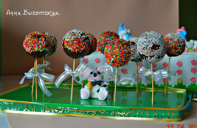 Но я очень старалась! Делала с огромным удовольствием. Все-таки такой праздник. И в итоге получился такой вот милый торт! Цену назвала символическую. Попсы тоже делала впервые, в подарок своей первой заказчице