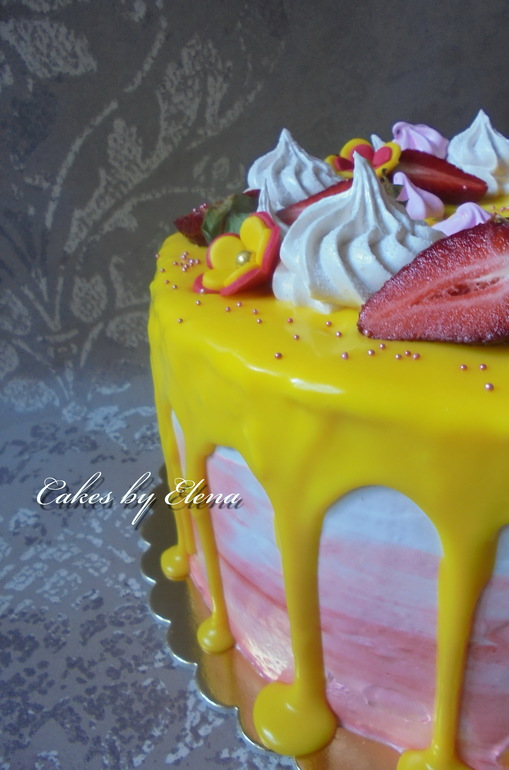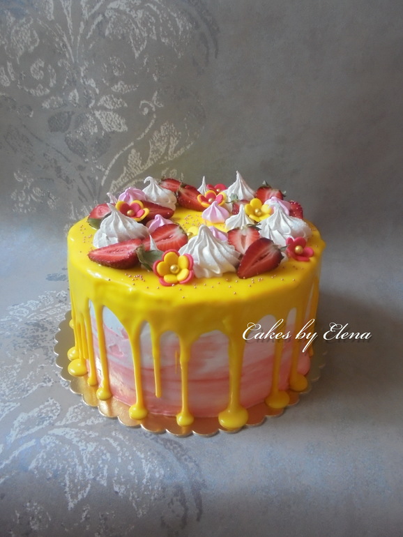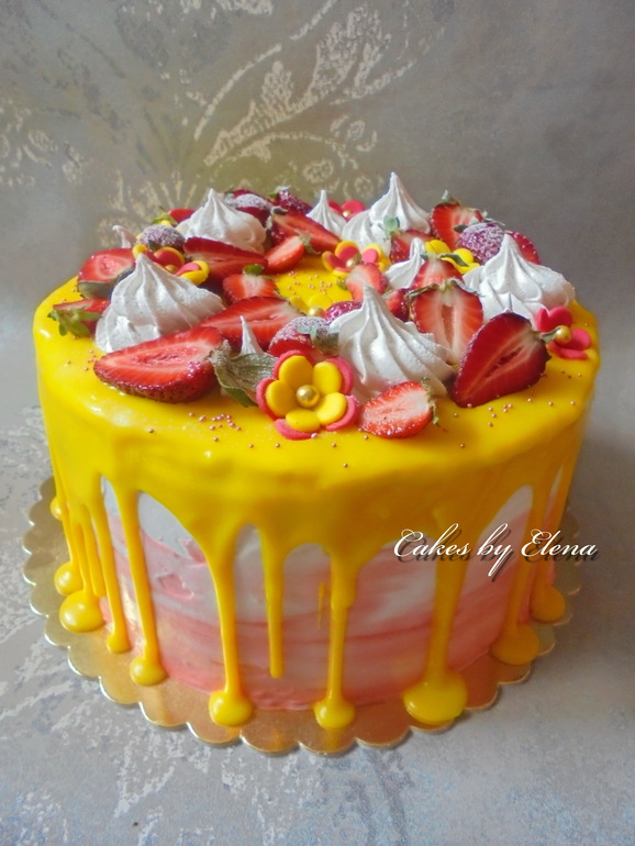 Ну а казус в том, что с заказчицей была обговорена только цветовая гамма ( сочетание желтого и красного), остальные моменты на мое усмотрение, а в конце выяснилось, что это торт для ее мужа на ДР... А я тут цветуечков насажала в абсолютной уверенности, что торт женский... Повыдергивала нафиг розовые безешки и добавила побольше клубники. Вобщем, вот такой не брутальный ни разу торт). Но все остались довольны и счастливы, а это главное)