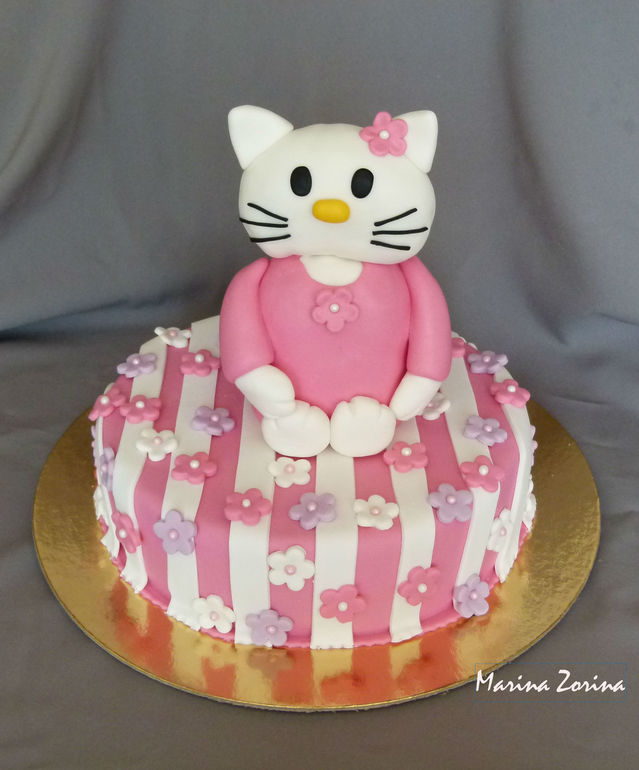 ваша ошибка был в теле.Оно больше чем должно быть при таком размере головы.Посмотрите тело у Китти ,которую вы пытались повторить гораздо меньше по отношению к голове.Глаза вы посадили близко ,их бы чуть чуть в стороны развести.И еще момент,никак не могла понять ,что не так ,но сейчас поняла.Вы голову слишком глубоко посадили на туловище.