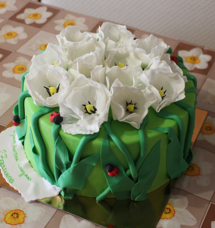 Спасибо! На ландыши совсем уже времени не было, сестра за день до дня рождения попросила сделать для ее свекрови тортик, уже потом смотря на фото подумала что надо было хотя бы бантик снизу прилепить( типа букетик) и низ торта "голый" остался