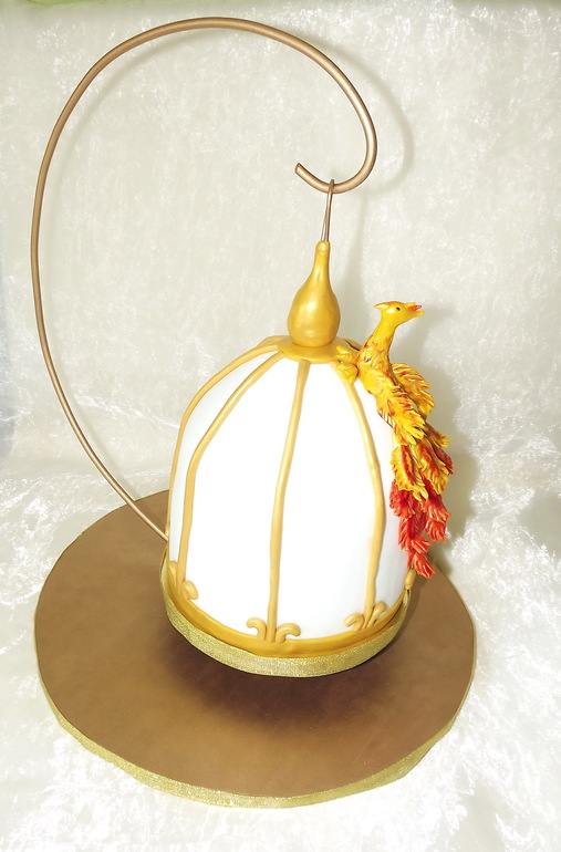 я чего то всех критикую в последнее время, но без критики нет роста))высота торты — отличная, самое то для клетки! нравится мне и цвет подложки (но не ее размер, торт потерялся), вот и сама конструкция импонирует) но...)) тут меня можно представить с рожками и трезубцем))) цвет самой клетки, для того, чтобы он был более гармоничным и натуральным, берите коричневую мастику и покрывайте золотым кандурином, будет смотрется как состаренное золото, это самое то в этом дизайне. про выравнивание сказали, вижу) прутьев надо было бы по больше, это ж клетка, а тут они редко смотрятся. и самое главное — это птица счастья, ей не хватает изящества, шею бы потоньше,лапки ей вообще можно не делать,и хвост,он должен быть вычурно богатым, тут хуже не будет)