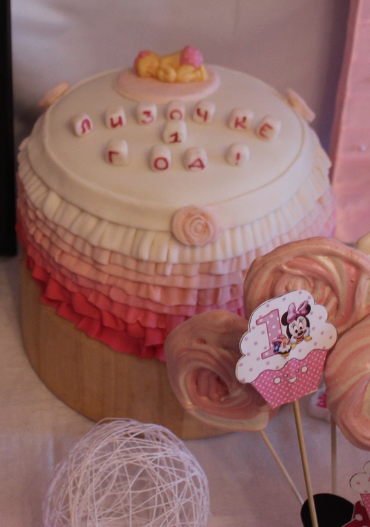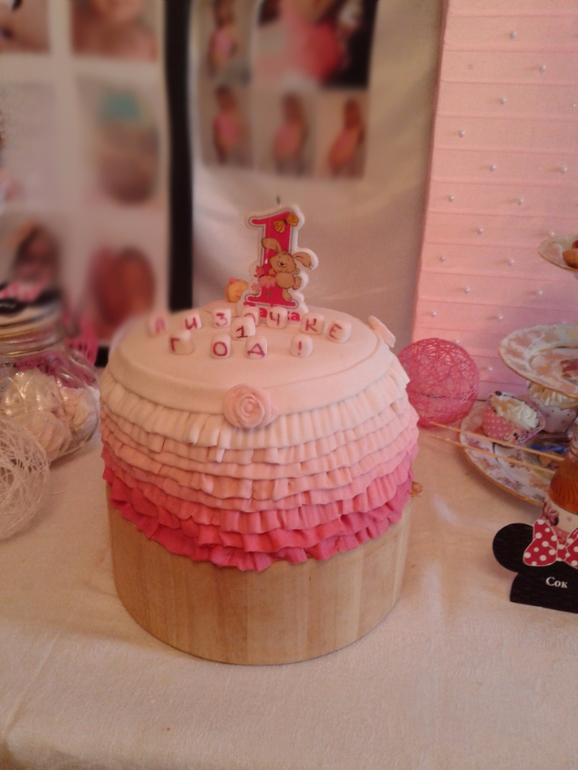 Проба пераВ первый раз я попробовала покрыть тортик мастикой. Сами коржи и сборку я еще на 6 месяцев делала, но тогда с мастикой из маршмелоу не заладилось, к сожалению. К годику я решила повторить свой эксперимент. Накануне Дня Рождения не спала до 2.30, собирала его, покрывала мастикой, а утром еще и рюши доделывала. Вот такой тортик у меня получился. Не идеален, конечно, но зато с любовью и от души.)