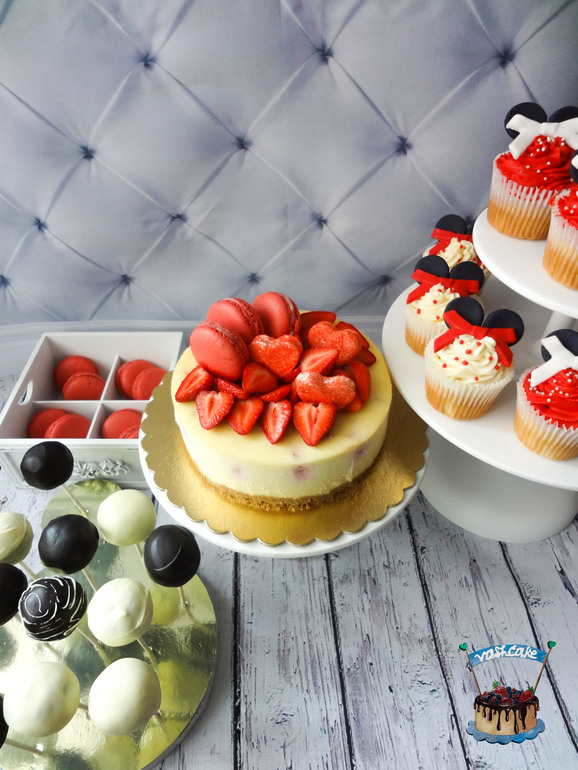 Торт "Чизкейк малиновый", украшен клубничными макарон, клубникой и клубничным маршмеллоу.
