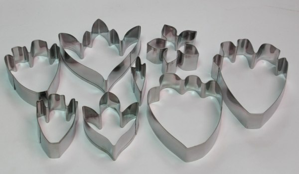 В наборе 8 резаков. Резаки изготовлены из нержавеющей стали 18/0, толщина - 0.3мм. Длина листов от 10 до 5,3 см; Х 9 до 1,7 см, длина цветов от 10,7 до 8 см; Х 7,7 до 5 см, звезда 6 см.