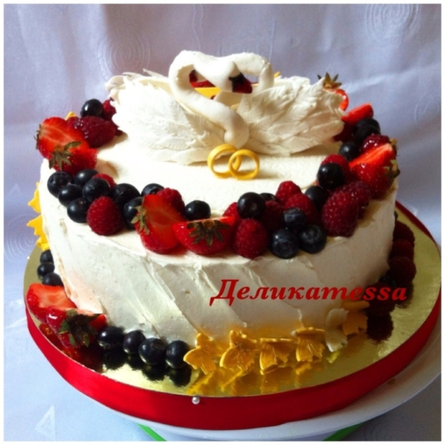 Украшение тортов кремом,шоколадом, фруктамиНет, не свадебный, но юбилейный! На "золотую" свадьбу. Прожить вместе 50 лет - не подвиг ли? Ванильный с ягодным конфи, сливочно-маскарпониевым кремом и свежими ягодами, 2,5 кг.
