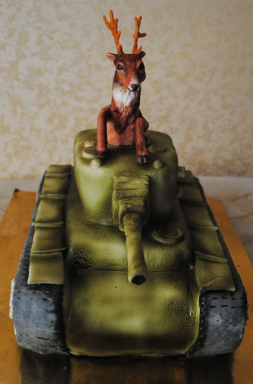 Торты для мужчинЕще один мужской торт. Для поклонника игры "World of tanks". Вот такое вот необычное сочетание - попросили сделать танк с сидящим в нем оленем. Я не знаток данной компьютерной игрушки, поэтому не знаю, честно сказать, что это значит. Но вроде все остались тортом довольны. Вес 4 кг. Шоколадные коржи, шоколадный крем, хрустящая прослойка фундук и вафли в белом шоколаде