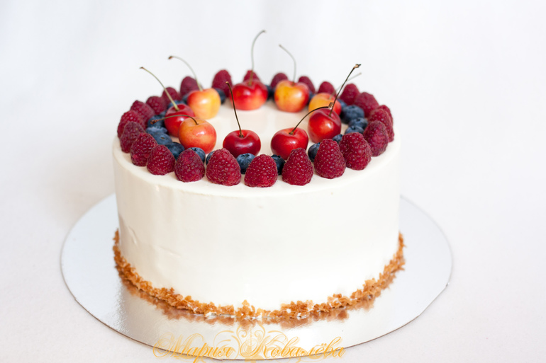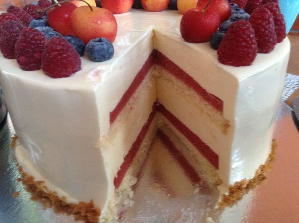 Украшение тортов кремом,шоколадом, фруктамиВнутри ванильный бисквит, баварский мусс на белом шоколаде, клубничное желе.