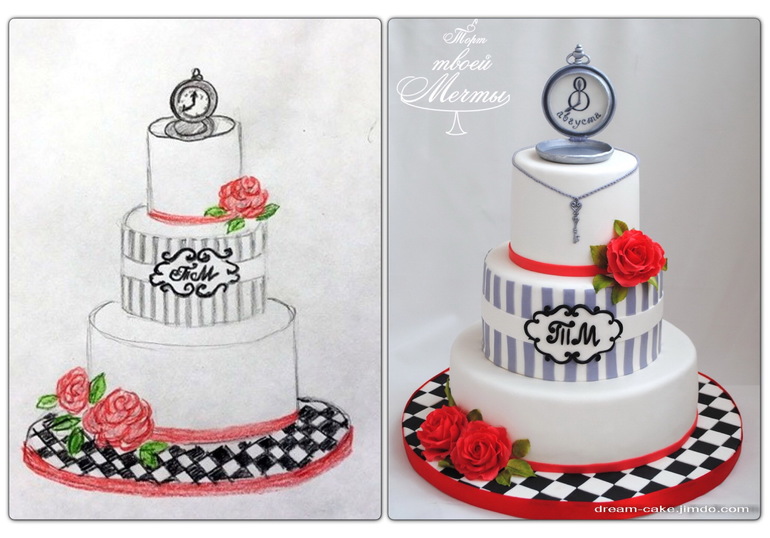 Эскиз рисовала с учётом пожеланий заказчиков. Вес 11,5 кг, ярусы 14-21-30 см, внутри "Молочная девочка" (шоколадные и светлые коржи, сливочный и карамельный крема, персики) - верх, торт с прослойкой кураги и грецкими орехами в карамели, шоколадный торт с вишней (низ).
