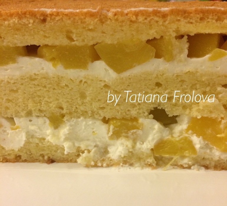 Внутри ванильный шифоновый бисквит пропитанный черешневым и персиковым сиропом (ровно до середины коржа одним, а с другой стороны вторым), сливочно-сырный крем с консервированными персиками и черешней. Вес 2,5 кг.
