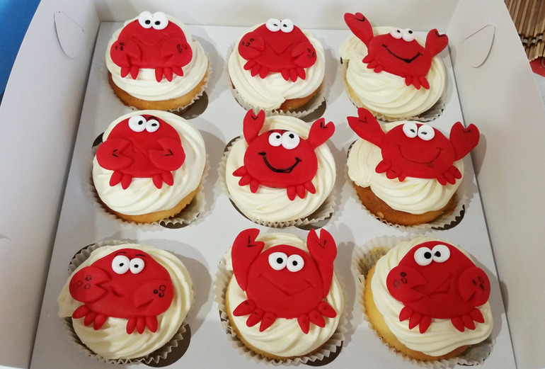 Капкейки и КейкпопсыКапкейки лимонные с лимонным курдом, крем - сливочный сыр, сверху крабики мастичные. Первый раз делала кремчиз с мастика, и все в порядке! мастика не потекла. А вот, формочка бумажная, за ночь в холодильнике, отстала. Кто знает почему?