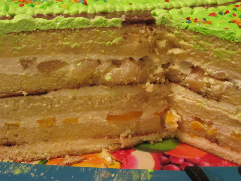 собирала торт в форме, он сутки стоял в холодильнике. потом украшала уже. фрукты внутри - груша и персик. можно любые