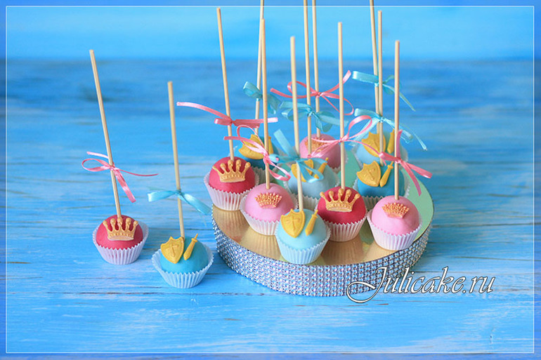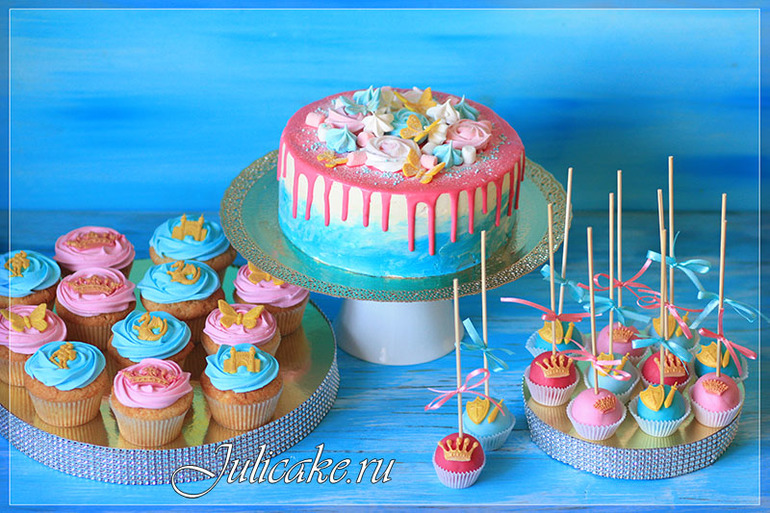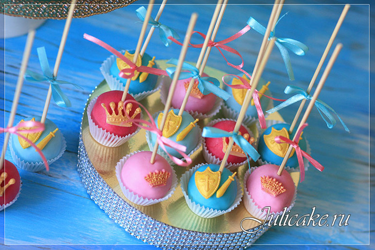 Определенной темы не было, нужно было цветовой гаммой разделить сладости для девочки и мальчика! Решили взять тему рыцари и принцессы :)