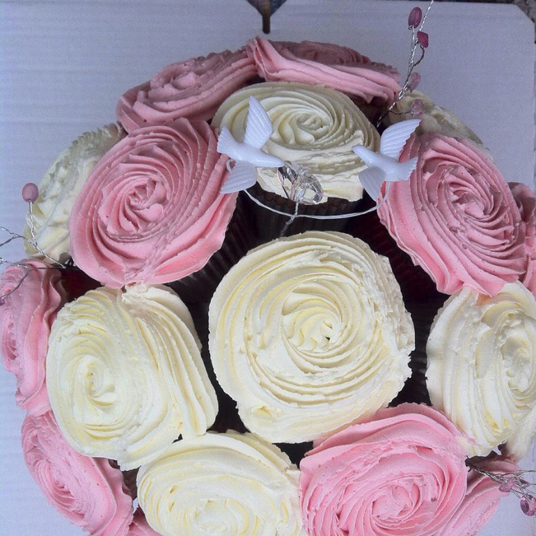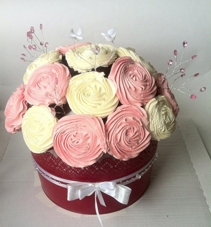 Вот такая красота получилась из 19 капкейков. Половина апельсиновые с карамелью, остальные - шоколадные с шоколадной глазурью. Крем швейцарская меренга с маслом.
