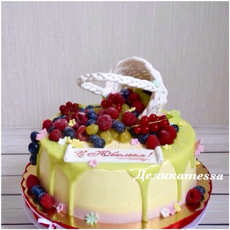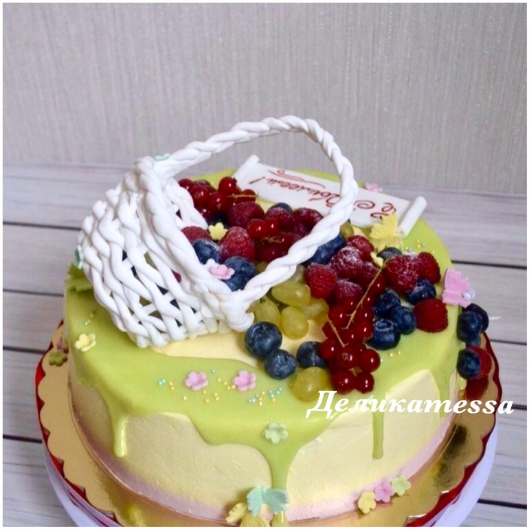 Ванильный бисквит, вишневое конфи, черносмородиновый крем, свежие малина и голубика, меренга. Корзинка, ясень пень, мастичная. 2300 кг