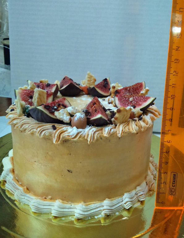 Сделала по минимуму,из расчета баночки маскарпоне 250гр,меньше у меня нет,украшала на скорую руку тем,что было,поэтому не очень аккуратно.Белково-масляный крем тонким слоем,инжир,крекер.И сама удивилась,взвесив готовый торт-1,6 кг,на фото можно увидеть внизу на весах.