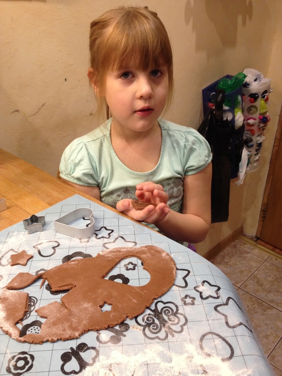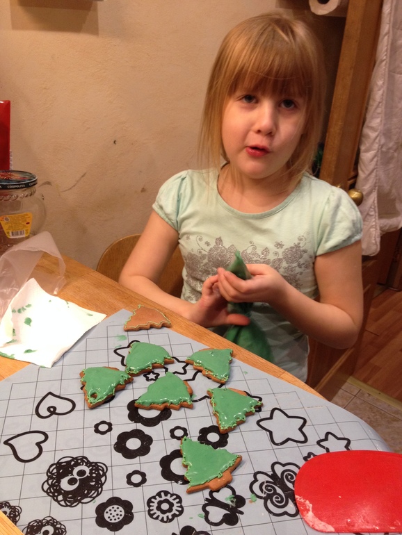 Катя во всю помогала - вырезала вырубками детали - елочки, звезды. Сама их росписывала)))