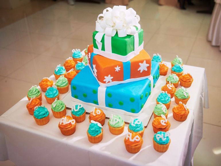 Торт получился на 15 кг и к нему было 40 капкейков в корпоративных цветах и с названием компании.