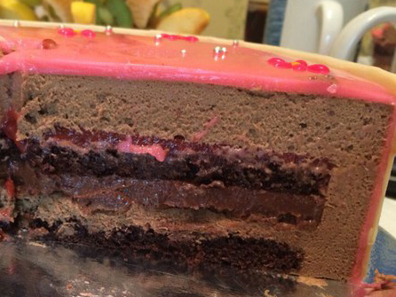 Внутри: шоколадный бисквит, клубничная пропитка на пюре, клубничное конфи, начинка клубника-шоколад, миндальный штрейзель, шоколадный мусс на pate a bombe.