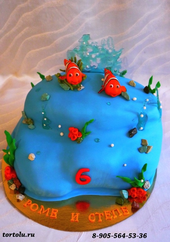 Торты детскиеПожелания были следующими: 2 рыбки клоуна как из мультфильма "В поисках Немо", водоросли, пузырьки воздуха, надпись.
