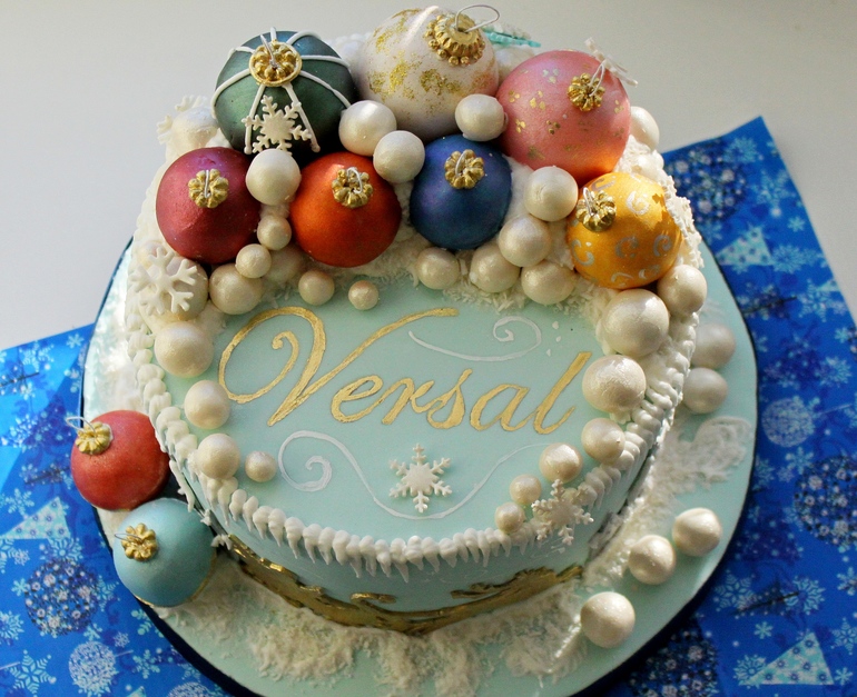 Этот торт поехал перед Новым годом в Москву как подарок заказчика своим бизнес-партнёрам. Внутри ванильный бисквит, сырный крем, прослойки шоколада и мини-маршмеллоу.