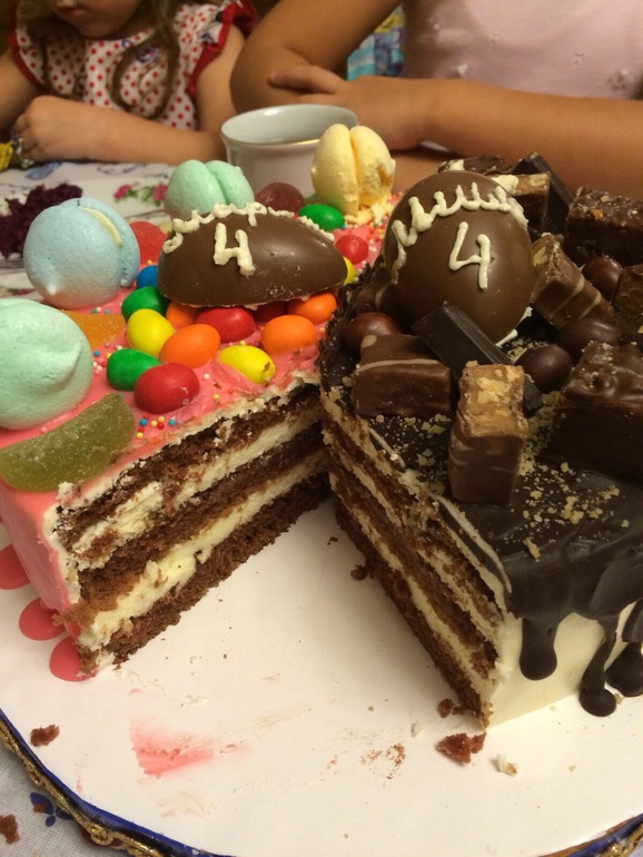 4. Торт для двойняшек (шоколадный бисквит, крем Пломбир, грильяж из грецких орехов). Вес 2,5 кг. Это мой первый торт с глазурью с подтеками, подтеки конечно оставляют желать лучшего))