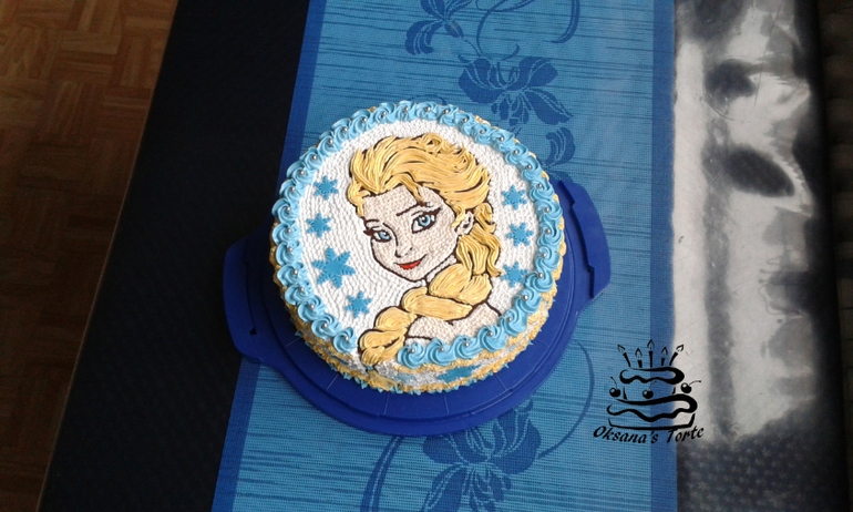 Нарисовала картинку шоколадом, перенесла на торт и раскрасила кремом( мелкими насадками- звездочка)