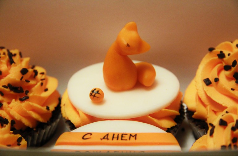 Вчера попросили срочно сделать 6 капкейков на День рождения. С оранжевым кремом, написать «С днем рождения, лисенок» и символическую лисичку слепить. Ну вроде бы все обсудили, я делаю. Вырезала волнистые полосочки, написала красивым шрифтом, маленькие цветочки приделала хорошенькие, в общем получилось миленько. А потом вдруг закралось сомнение… и решила я спросить кому это вообще? Ну и конечно выясняется, что молодому человеку