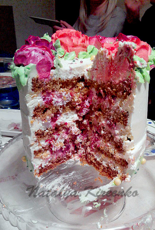 Начинка: морковный с арахисом, сметанный крем, много свежей малины, сверху сырный крем. Трещины меня вчера тоже стороной не обошли, ну хоть не текло ничего и благо, везти не нужно было, этажом ниже спустились :) Подарила торт, хозяйка его тут же подрехтовала холодильником , уж больно много у него выступов :) но мне уже было почти все равно :))) Дарила целый и ладно.