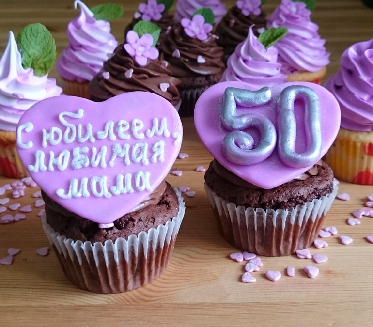 Капкейки и КейкпопсыКапкейки для любимой мамочки на 50-летний юбилей! Шоколадный и ванильный бисквиты, крем белково-заварной и шоколадный, начинка домашняя солёная карамель и ганаш из молочного шоколада.