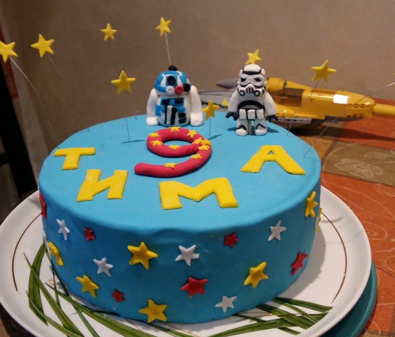 Проба пераДобрый день! Как это обычно бывает, насмотревшись на Ваши произведения искусства, я безумно захотела тоже попробывать испечь первый в своей жизни торт.Понимаю конечно, что с Вашими таворениями он и рядом не стоял))), но все же покажу что у меня получилось. Делала я его на День Рождения старшего сынишки. И еще хочу сказать, что это очень тяжелый труд и я, девочки, восхищаюсь Вами!!!