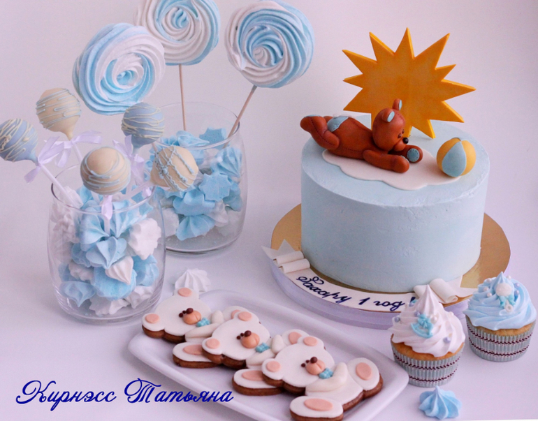 Кенди-бар в нежных бело-голубых тонах для близнецов-годовасиков.