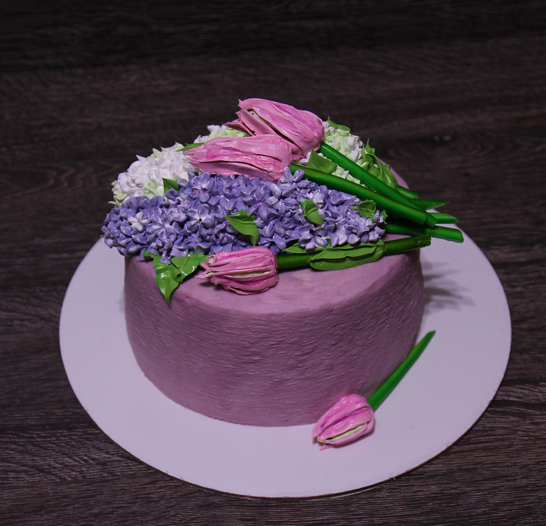 Мне нравится! Вот только зелень я бы все-таки ближе к немного другого цвета сделала бы, но так и замечательно!А каким кремом украшаете и каким тортик покрываете? И какую насадку для сирени используете?