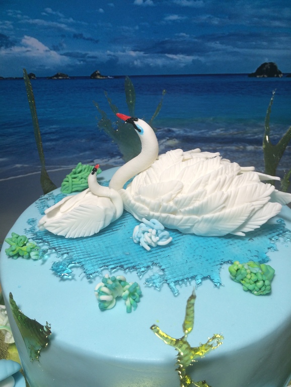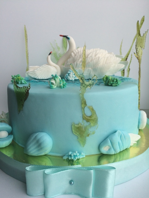 Она нарисовала эскиз, рассказала как лебедя делать (как-то смотрела на ютубу), сама сделала маленького лебедя полностью, весь декор ее, кроме изомальта. В общем с пользой провели вечерок и денек. Кстати, почти все она делала полностью самостоятельно, пока я младшую спать укладывала и намного поспала) А лепить из пластилина-это скучно уже, а вот из мастики. ух, а сколько еще осталось декора не использованного)