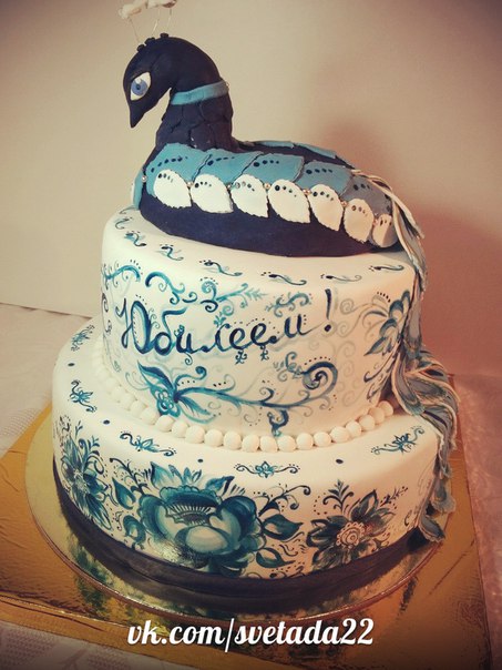 Торты юбилейныеДама-юбиляр всю жизнь коллекционирует Гжель. Любящая дочь решила порадовать ее тортом в любимом стиле. 6 кг, низ - "Золотой ключик", средний ярус - "Птичье молоко", Жар-птица - "картошка" с грецкими орехами. Роспись AmeriСolor.