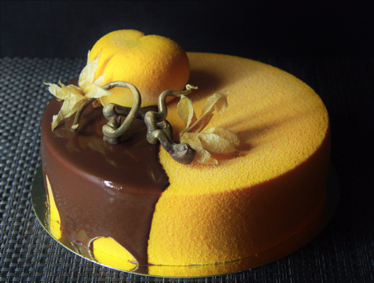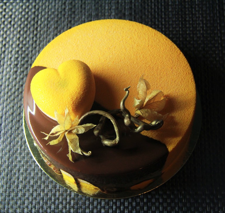 Внутри фундучный крустилант, фундучный бисквит, шоколадное кремю, абрикосовый крем, абрикосовый мусс. Внутри сердечка тоже абрикосовый мусс и брусничное конфи.