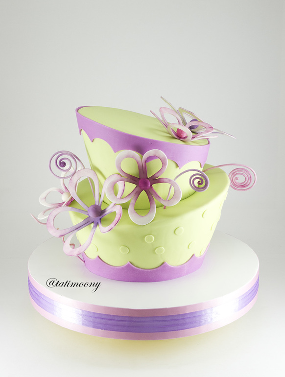 "Тадам" бывает тогда, когда заказчики говорят, да, делайте так, хорошо. Мне прислали совершенно иной торт, сказали, сделайте нижний ярус фиолетовый, верхний - зеленый и цветочки сверху., и кривой..... Посидела, подумала и решила, что надо это все оформить, придав стиль и свое настроение. Нашла торт с подобными цветами, отправила заказчикам, чем привела их в шок. Но они рискнули и остались довольны. Сказали, это не то что мы просили, но остались очень довольны.