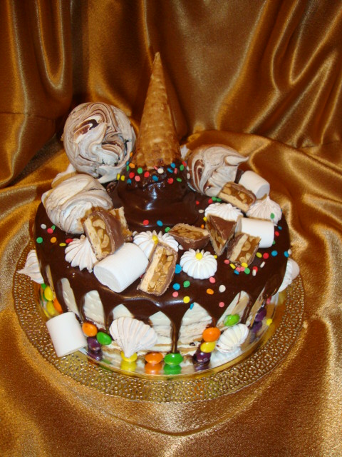 Проба пераУж очень и мне хотелось сделать яркий праздничной тортик в стиле Рожок или Конфетный взрыв. Сегодня ездила сватать невесту для сына и по случаю испекла песочный тортик по рецепту Алёны В., но как украсить его, так и не определилась, поэтому решила смешать рожок с конфетами, получился тортик два в одном... Отдельное спасибо Алёне за вкуснющий рецепт.