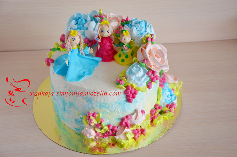 Торты детскиеТорт для трех сестренок, которые умудрились родиться в один день с разницей в несколько лет. Внутри 2,0 кг клубничного поцелуя. Оформление сверху -швейцарская меренга (без масла).