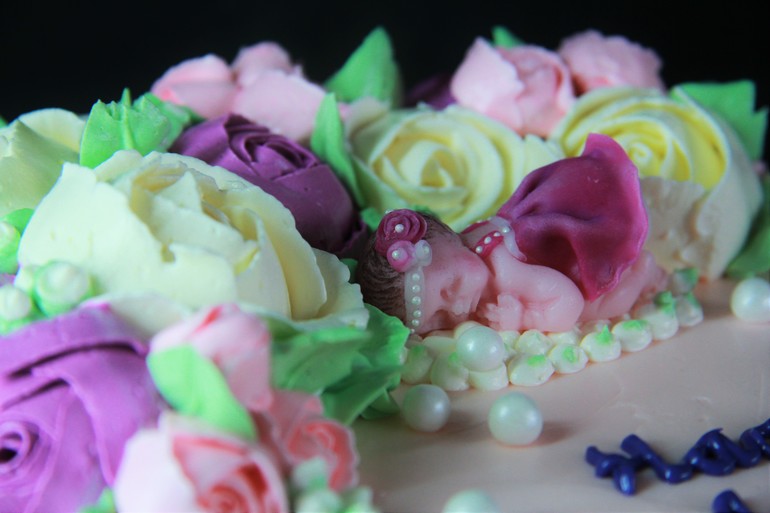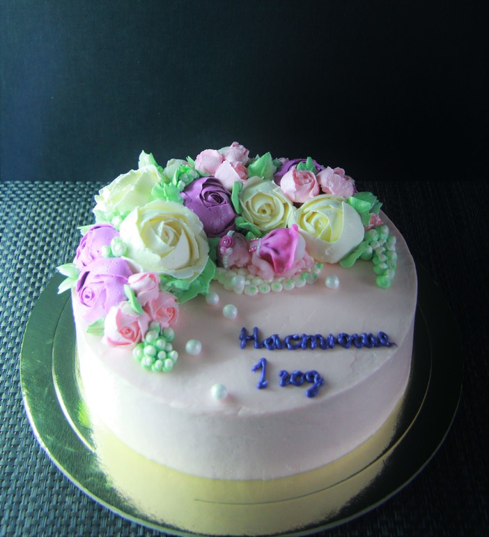 Опять цветы)))) Заказчица просила совместить кремовые цветы и малыша. Сначала я отговаривала, но потом решила попробовать) Ну ничего получилось, мне кажется. Хотя без младенца и надписи торт выглядит лучше)