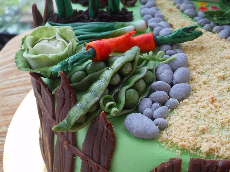 Планировался просто тортик, чтобы приятно сделать, можно было и не лепить ни чего, но мне хочется) вот и решила оторваться)) Сначала должен был быть просто огород, попробовать капусту, тыкву, горох хотела, а в конце, когда уже все овощи были готовы и осталось их только разложить по местам, муж про домик напомнил (я когда искала идеи показывала ему несколько картинок с домиком), а где домик, а нет его, забыла я про него совсем, а надо ж домик то))) У меня оставался бисквит, бугорки с коржей срезала, быстро соорудила из них подобие домика, смазав между собой кремом, в морозилку, потом обрезала ровно все уже на застывшем, мастикой покрыла, шторочки(!!!)(самое мое любимое в этом торте, они тончайшие получились, с кружавчиками)), цветочки, чуть кисточкой подтенила, кирпичики, на шпажку и в торт))) Любуюсь))))....