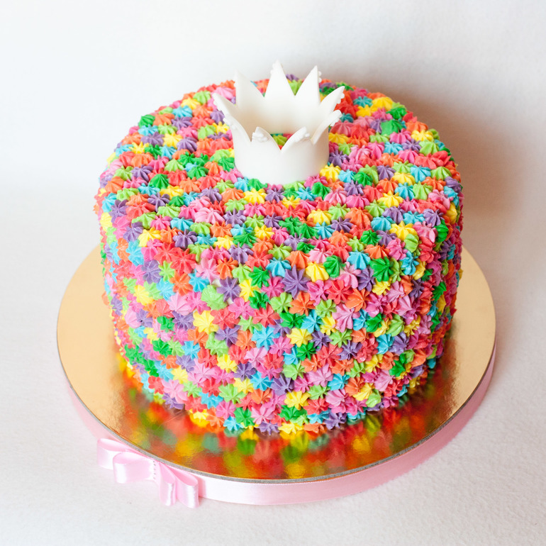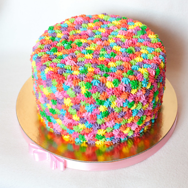 Очень нравится оформление! А как пимпочки ставили? Сначала одним цветом хаотично по всему торту, затем другим и т.д.? Я правильно понимаю?